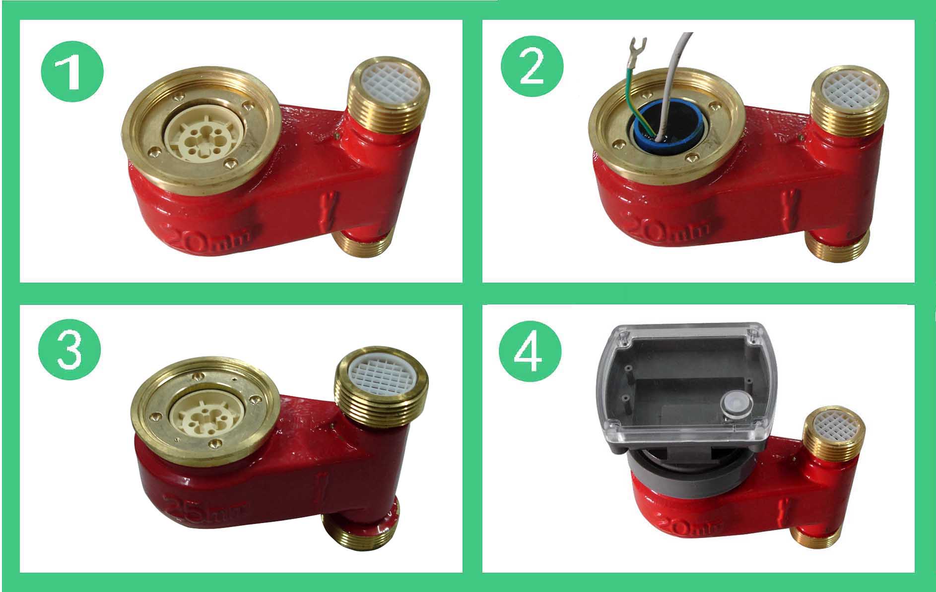 DS97TAR多流束無磁熱量表流量計的結(jié)構(gòu)如圖,其工作原理是:熱水進(jìn)入流量計,經(jīng)進(jìn)水導(dǎo)向孔沖擊計量腔內(nèi)的葉輪旋轉(zhuǎn),再經(jīng)出水導(dǎo)向孔流出流量計。葉輪上面嵌有不銹鋼膜片,隨葉輪旋轉(zhuǎn),在隔板上端接近不銹鋼膜片處可裝電感類傳感器,接受葉輪旋轉(zhuǎn)的周期信號。