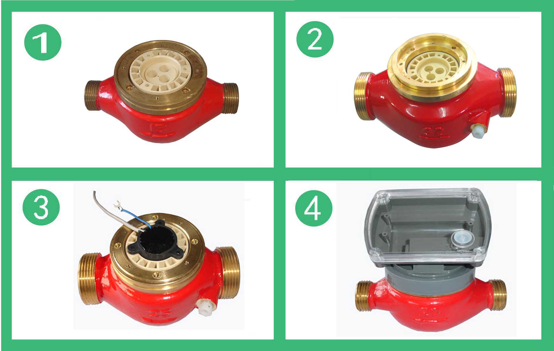 DS97TAR多流束無磁熱量表流量計的結(jié)構(gòu)如圖,其工作原理是:熱水進(jìn)入流量計,經(jīng)進(jìn)水導(dǎo)向孔沖擊計量腔內(nèi)的葉輪旋轉(zhuǎn),再經(jīng)出水導(dǎo)向孔流出流量計。葉輪上面嵌有不銹鋼膜片,隨葉輪旋轉(zhuǎn),在隔板上端接近不銹鋼膜片處可裝電感類傳感器,接受葉輪旋轉(zhuǎn)的周期信號。
