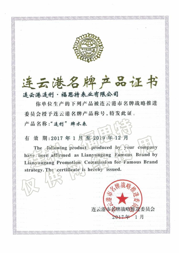 連云港名牌產品證書